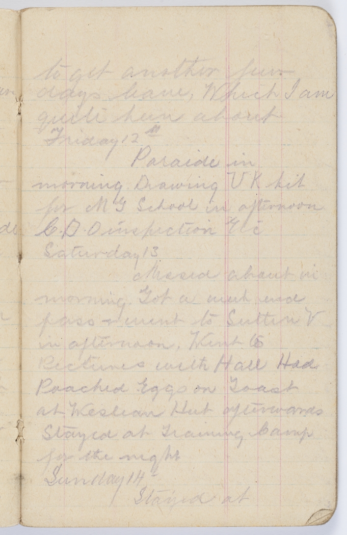 Mesed about in morning. Got a week end pass & went to Sutten V in afternoon. Went to Pictures with Hall. Had Poached Egg on Toast at Weslean Hut afterwards Stayed at Training Camp for the night