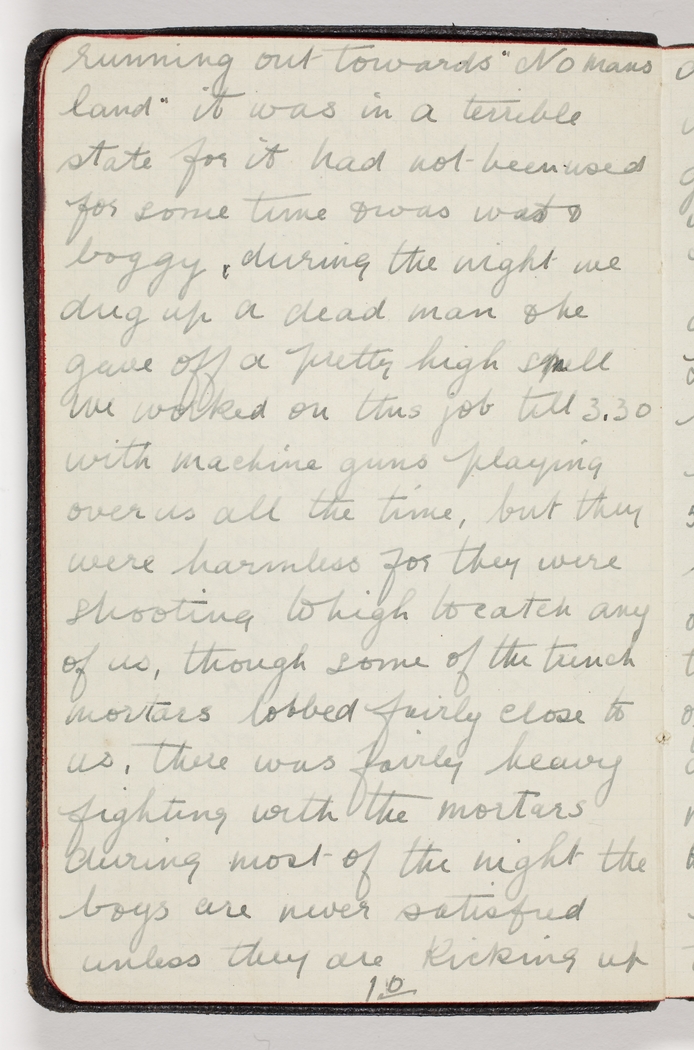 running out towards "No mans land" it was in a terrible state for it had not been used for some time & was wet & boggy, during the night we dug up a dead man & he gave off a pretty high smell We worked on this job till 3.30 with machine guns playing over us all the time, but they were harmless for they were shooting to high to catch any of us, though some of the trench mortars lobbed fairly close to us, there was fairly heavy fighting with the mortars during most of the night the boys are never satisfied unless they are kicking up