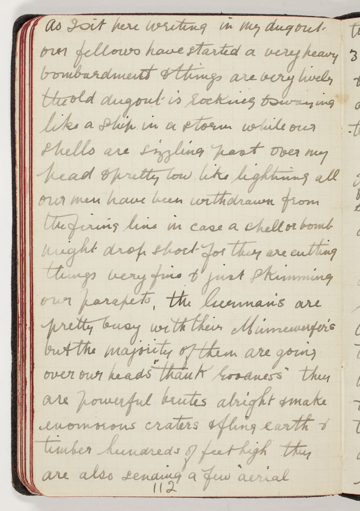 As I sit here writing in my dugout our fellows have started a very heavy bombardment & things are very lively the old dugout is rocking & swaying like a ship in a storm while our shells are sizzling past over my head & pretty low like lightning all our men have been withdrawn from the firing line in case a shell or bomb might drop short for they are cutting things very fine & just skimming our parapets, the Germans are pretty busy with
