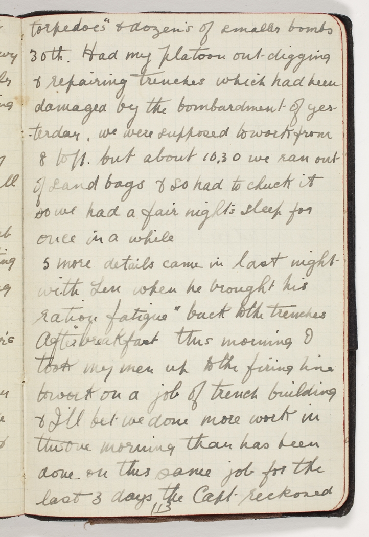 30th. Had my platoon out digging & repairing trenches which had been damaged by the bombardment of yesterday, we were supposed to work from 8 to 11. but about 10.30 we ran out of sand bags & so had to chuck it so we had a fair nights sleep for once in a while.