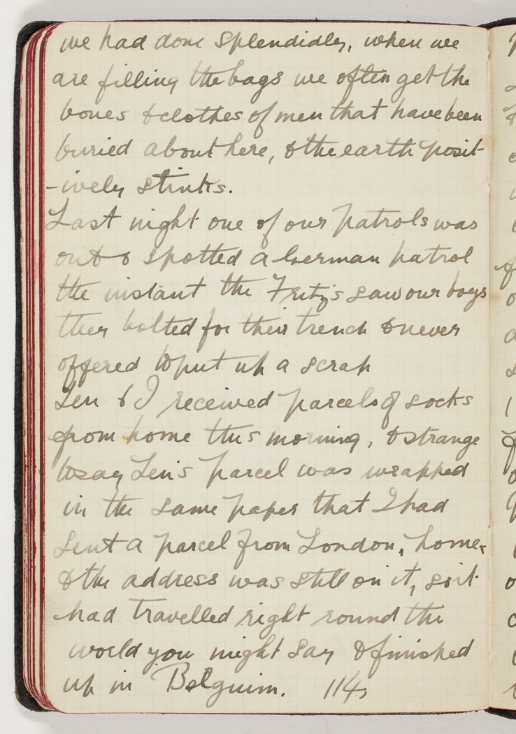 Len & I received parcels of socks from home this morning, & strange to say Len's parcel was wrapped in the same paper that I had sent a parcel from London, home, & the address was still on it, so it has travelled right round the world you might say & finished up in Belguim.
