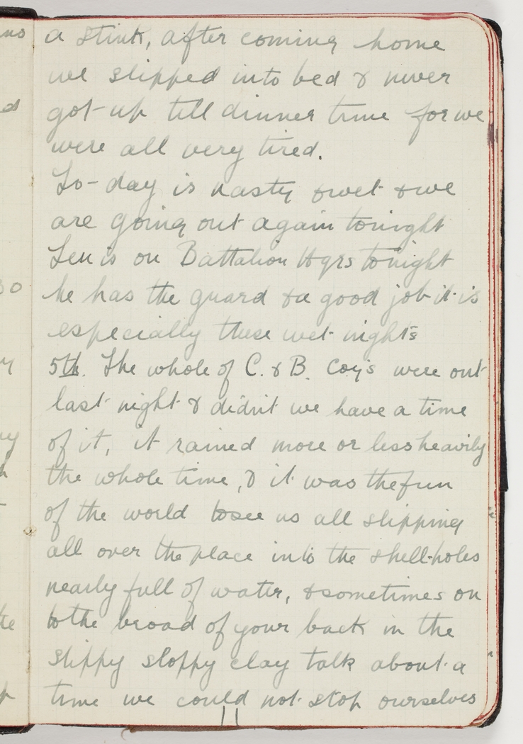 5th. The whole of C. & B. Coy's were out last night & didn't we have a time of it, it rained more or less heavily the whole time, & it was the fun of the world to see us all slipping all over the place into the shell-holes nearly full of water, & sometimes on to the broad of your back in the slippy sloppy clay talk about a time we could not stop ourselves