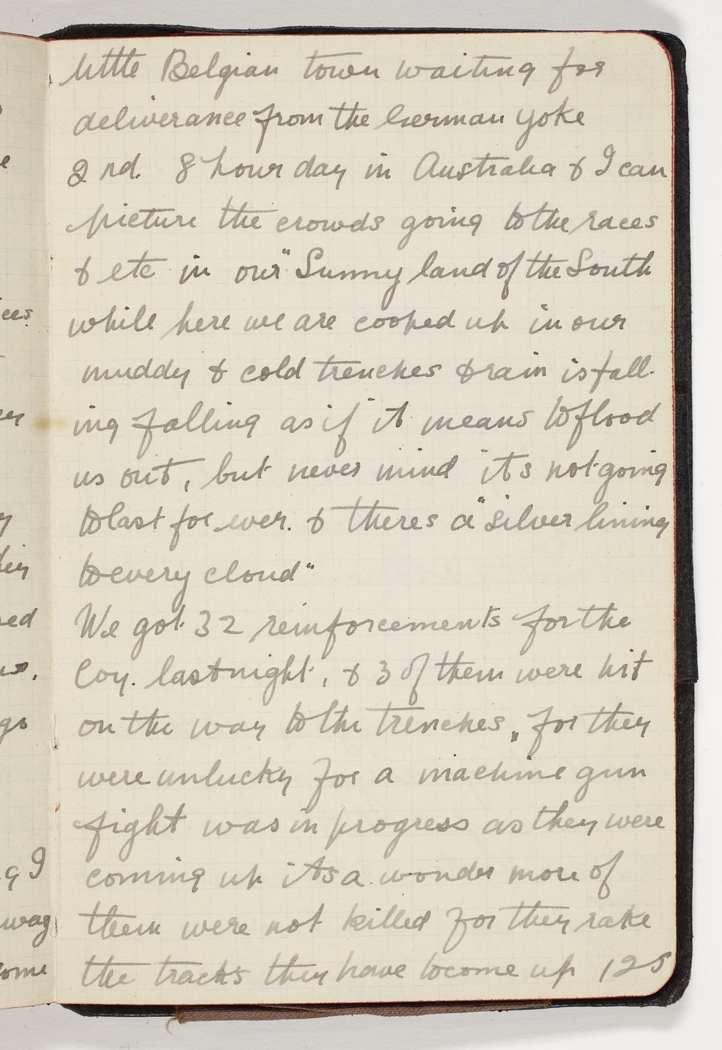 2nd. 8 hour day in Australia & I can picture the crowds going to the races & etc in our "Sunny land of the South while here we are cooped up in our muddy & cold trenches & rain is falling falling as if it means to flood us out, but never mind its not going to last for ever & theres a "silver lining to every cloud"