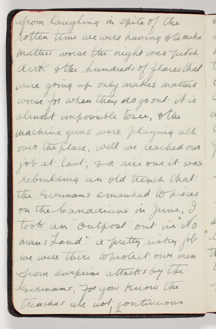 from laughing in spite of the rotten time we were having & to make matters worse the night was pitch dark & the hundreds of flares that were going up only makes matters worse for when they do go out it is almost impossible to see, & the machine guns were playing all over the place, well we reached our job at last, & a nice one it was rebuilding an old trench that the Germans smashed to pieces on the Canadians in June, I took an "Outpost" out in "No mans Land" a pretty risky job we were there to protect our men from surprise attacks by the Germans, for you know the trenches are not continuous