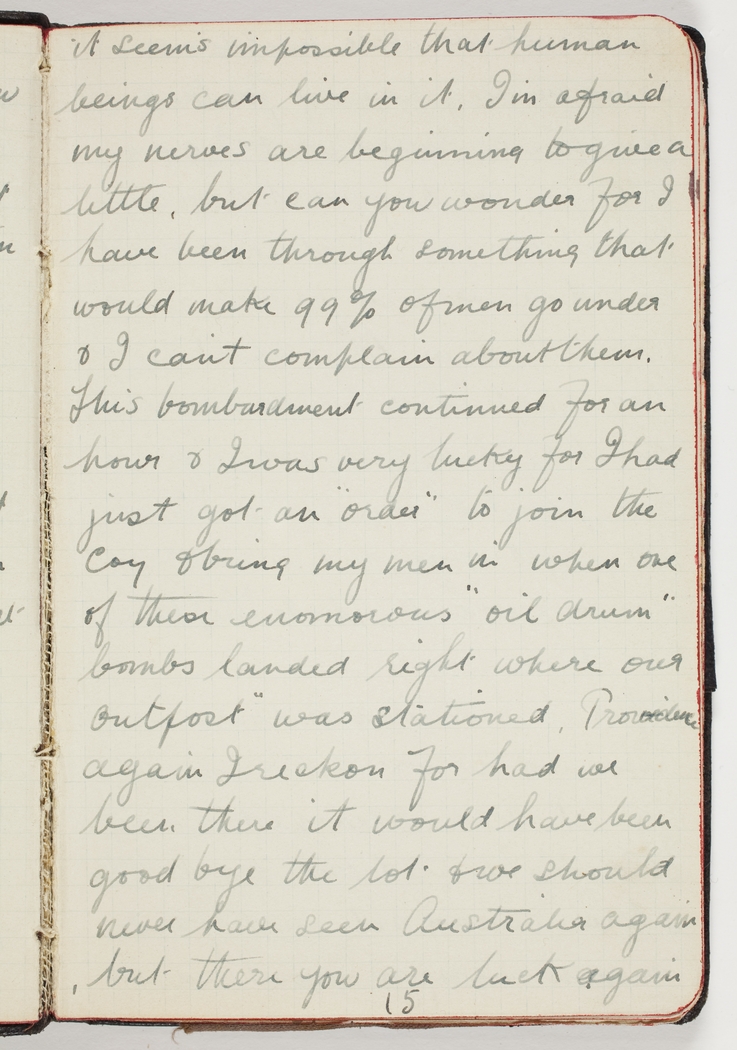 This bombardment continued for an hour & I was very lucky for I had just got an "order" to join the Coy & bring my men in when one of these enormous "oil drum" bombs landed right where our outpost" was stationed, Providence again I reckon for had we been there it would have been good bye the lot & we should never have seen Australia again, but there you are luck again