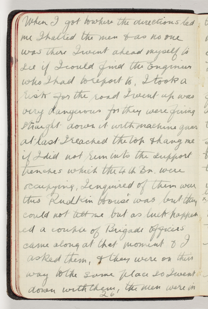 When I got to where the directions led me I halted the men & as no one was there I went ahead myself to see if I could find the Engineer who I had to report to, I took a risk for the road I went up was very dangerous for they were firing straight down it with machine guns at last I reached the top & hang me if I did not run into the support trenches which the 4th Bn. were occupying, I enquired of them were this Rudkin House was but they could not tell me but as luck happened a couple of Brigade officers came along at that moment & I asked them, & they were on their way to the same place so I went down with them, the men were in