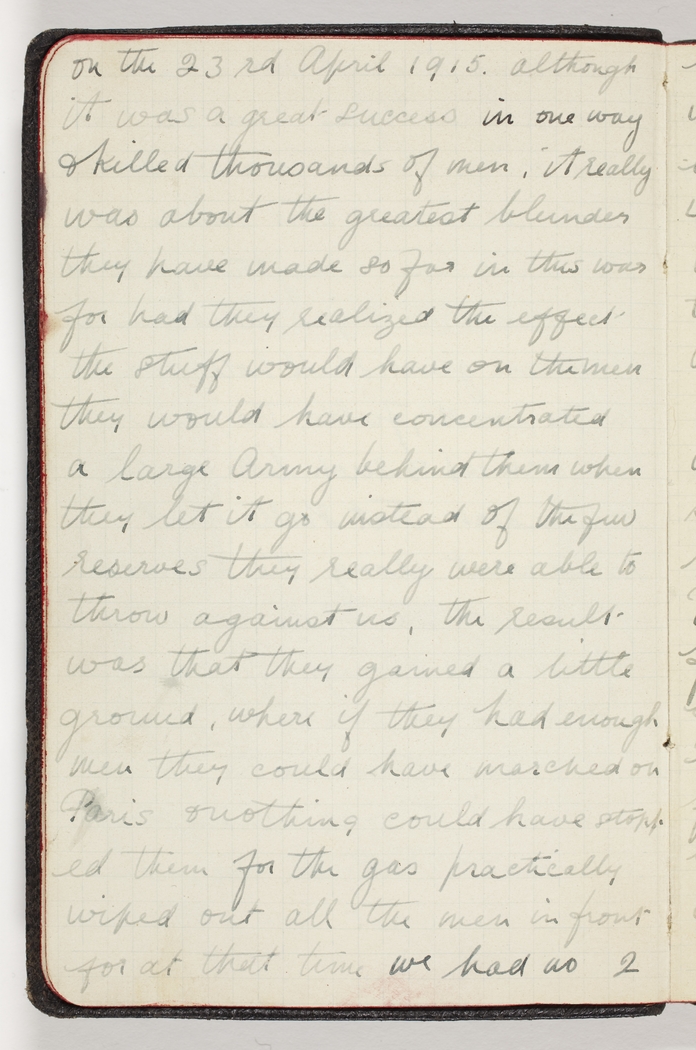 on the 23rd April 1915 although it was a great success in one way & killed thousands of men, it really was about the greatest blunder they have made so far in this war for had they realized the effect the stuff would have on the men they would have concentrated a large Army behind them when they let it go instead of the few reserves they really were able to throw against us, the result was that they gained a little ground, where if they had enough men they could have marched on Paris & nothing could have stopped them for the gas practically wiped out all the men in front for at that time we had no