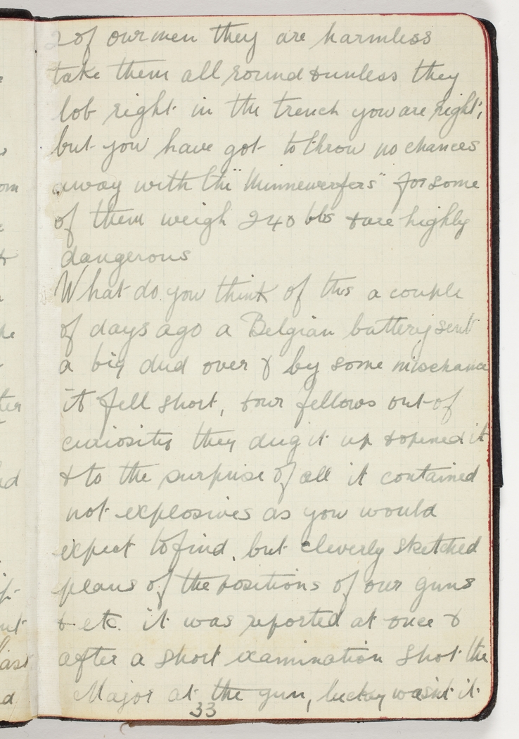 What do you think of this a couple of days ago a Belgian battery sent a big dud over & by some mischance it fell short, & our fellows out of curiosity they dug it up & opened it & to the surprise of all it contained not explosives as you would expect to find, but cleverly sketched plans of the positions of our guns & etc. it was reported at once & after a short examination shot the Major at the gun, lucky wasn't it