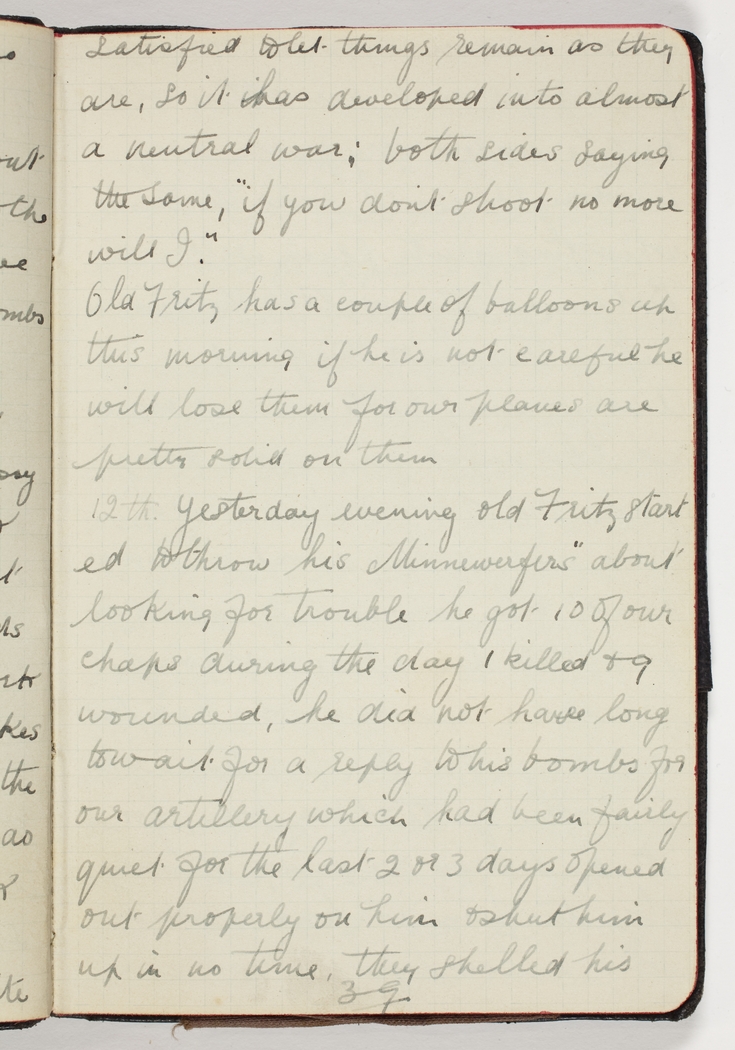12th. Yesterday evening old Fritz started to throw his Minnewerfers about looking for trouble he got 10 of our chaps during the day 1 killed & 9 wounded, he did not have long to wait for a reply to his bombs for our artillery which had been fairly quiet for the last 2 or 3 days opened out properly on him & shut him up in no time, they shelled his