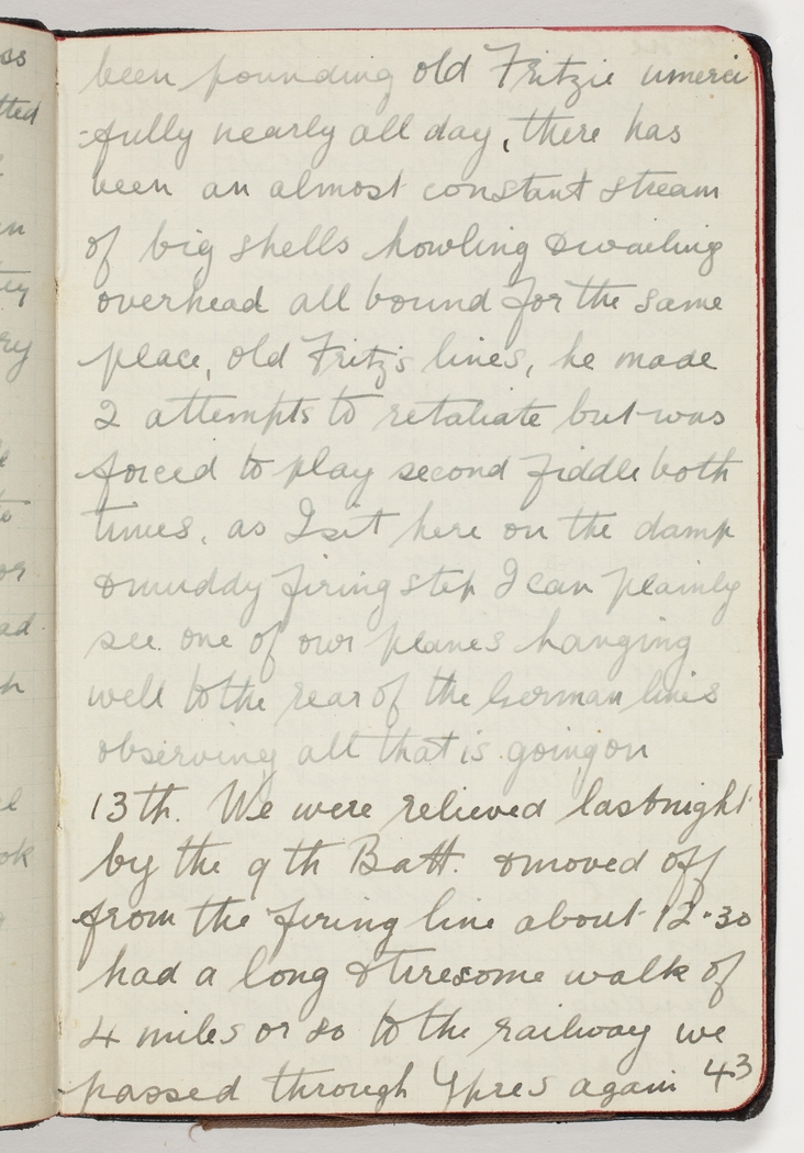 13th. We were relieved last night by the 9th Batt. & moved off from the firing line about 12.30 had a long & tiresome walk of 4 miles or so to the railway we passed through Ypres again