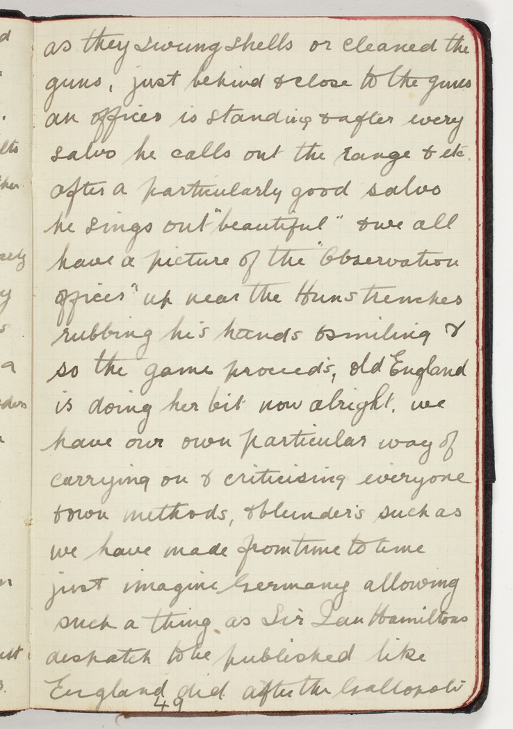 as they swung shells or cleaned the guns, just behind & close to the guns an officer is standing & after every salvo he calls out the range & etc. after a particularly good salvo he sings out "beautiful" & we all have a picture of the "Observation Officer" up near the Huns trenches rubbing his hands & smiling & so the game proceed's, old England is doing her bit now alright, we have our own particular way of carrying on & criticising everyone & own methods, & blunders such as we have made from time to time just imagine Germany allowing such a thing as Sir Ian Hamiltons despatch to be published like England did after the Gallopoli