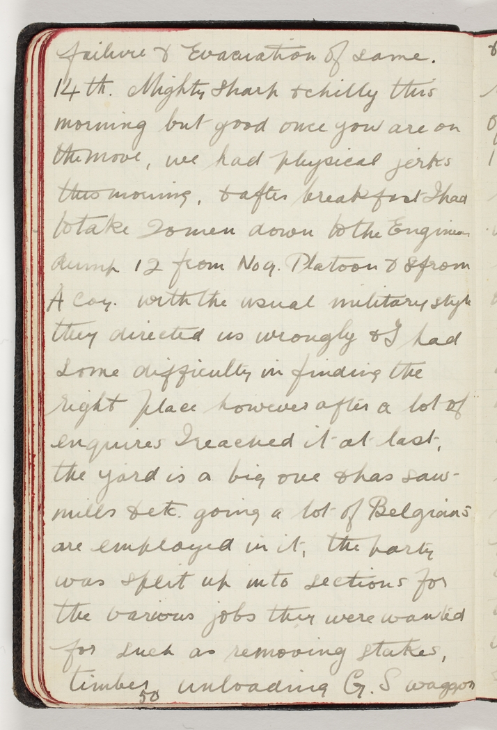 14th. Mighty sharp & chilly this morning but good once you are on the move, we had physical jerks this morning, & after breakfast I had to take 20 men down to the Engineer dump 12 from No 9. Platoon & 8 from A Coy. with the usual military style they directed us wrongly & I had some difficulty in finding the right place however after a lot of enquiries I reached it at last, the yard is a big one & has sawmills & etc. going a lot of Belgians are employed in it, the party was split up into sections for the various jobs they were wanted for such as removing stakes, timber, unloading G.S. waggon