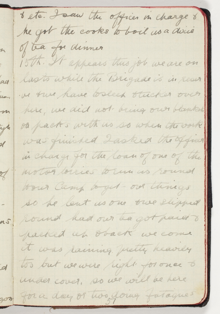 15th. It appears this job we are on lasts while the Brigade is in reserve & we have to sleep & tucker over here, we did not bring our blankets or packs with us so when the work was finished I asked the officer in charge for the loan of one of the motor lorries to run us round to our Camp to get our things so he lent us one & we slipped round had our tea got paid & packed up & back we come it was raining pretty heavily too but we were right for once & under cover, so we will be here for a day or two doing fatigues
