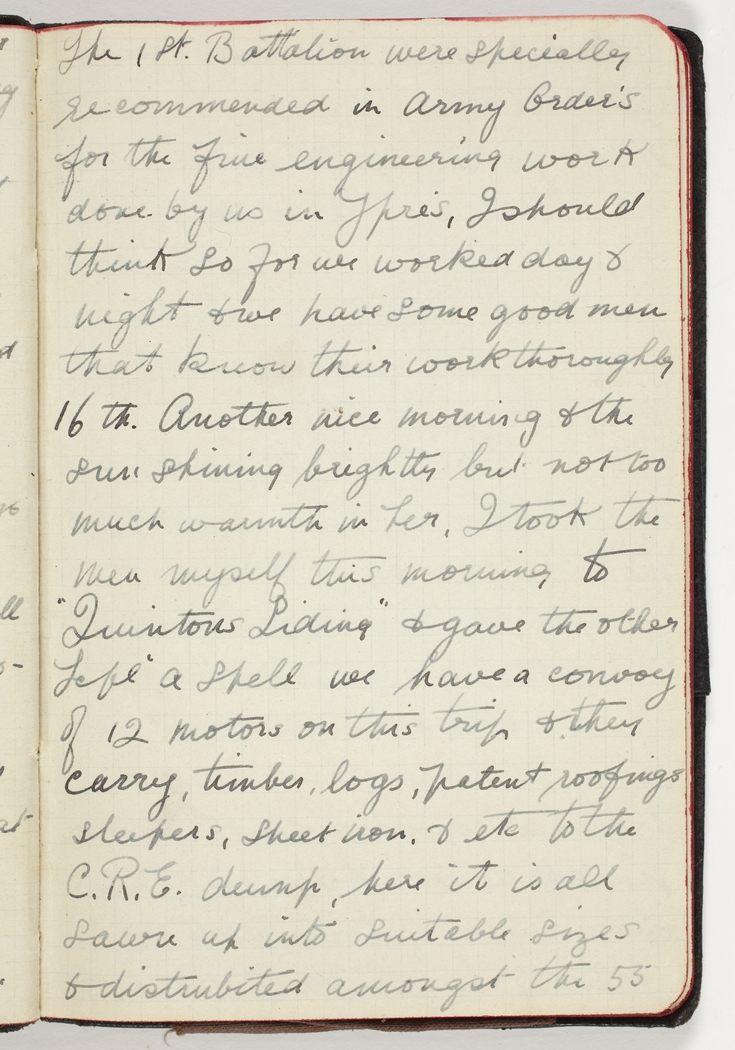 16th. Another nice morning & the sun shining brightly but not too much warmth in her, I took the men myself this morning to "Quintons Siding" & gave the other Lcpl a spell we have a convoy of 12 motors on this trip & they carry, timber, logs, patent roofings, sleepers, sheet iron, & etc. to the C.R.E. dump, here it is all sawn up into suitable sizes & distrubited amongst the