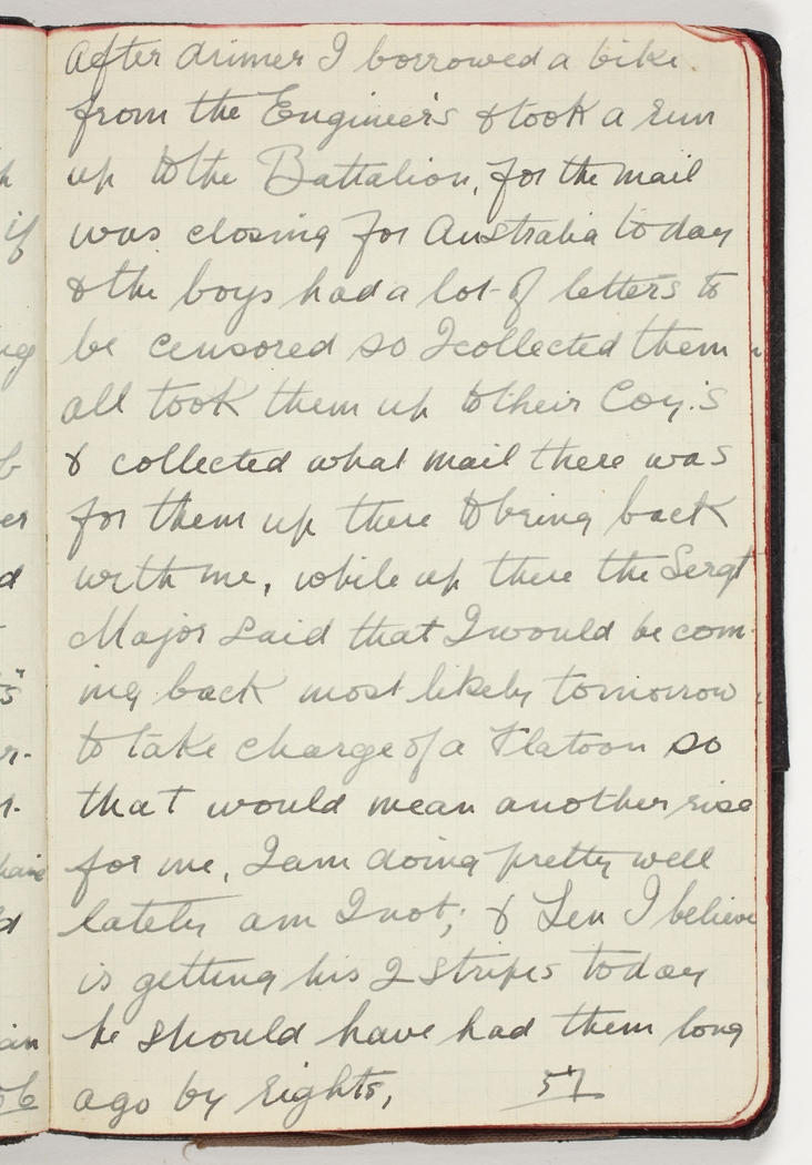 After dinner I borrowed a bike from the Engineer's & took a run up to the Battalion, for the mail was closing for Australia to day & the boys had a lot of letters to be censored so I collected them all took them up to their Coy.'s & collected what mail there was for them up there to bring back with me, while up there the Sergt Major said that I would be coming back most likely tomorrow to take charge of a Platoon so that would mean another rise for me, I am doing pretty well lately am I not; & Len I believe is getting his 2 stripes today he should have had them long ago by rights,