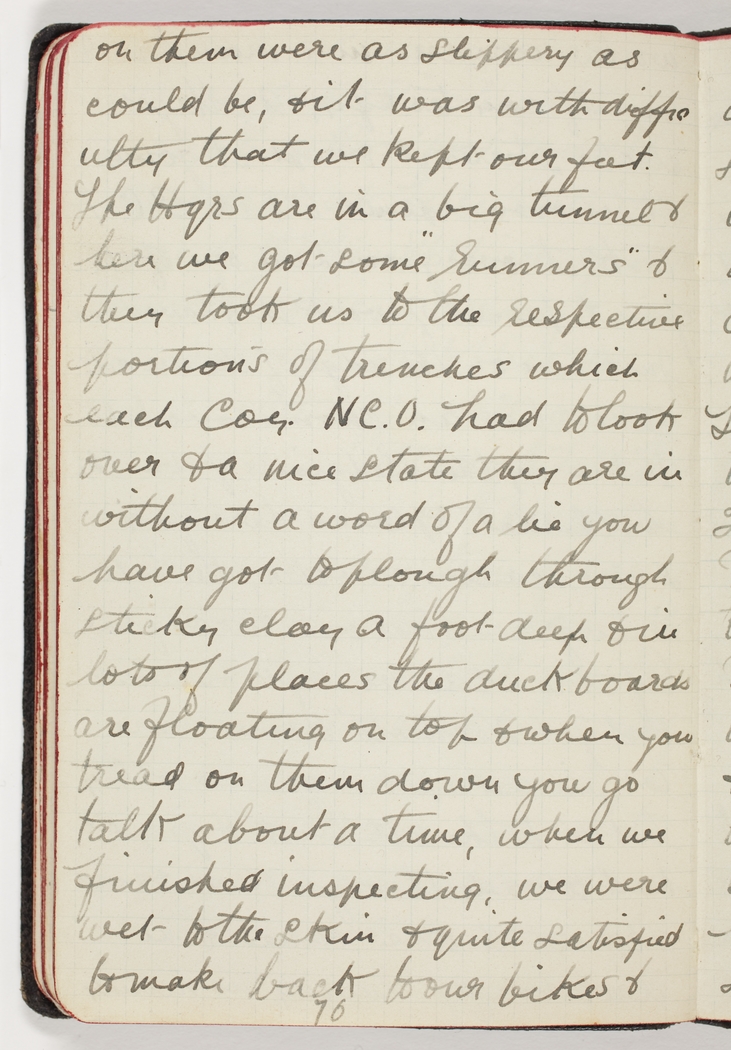 The Hqrs are in a big tunnel & here we got some "runners" & they took us to the respective portions of trenches which each Coy. N.C.O. had to look over & a nice state they are in without a word of a lie you have got to plough through sticky clay a foot deep & in lots of places the duckboards are floating on top & when you tread on them down you go talk about a time, when we finished inspecting, we were wet to the skin & quite satisfied to make back to our bikes &