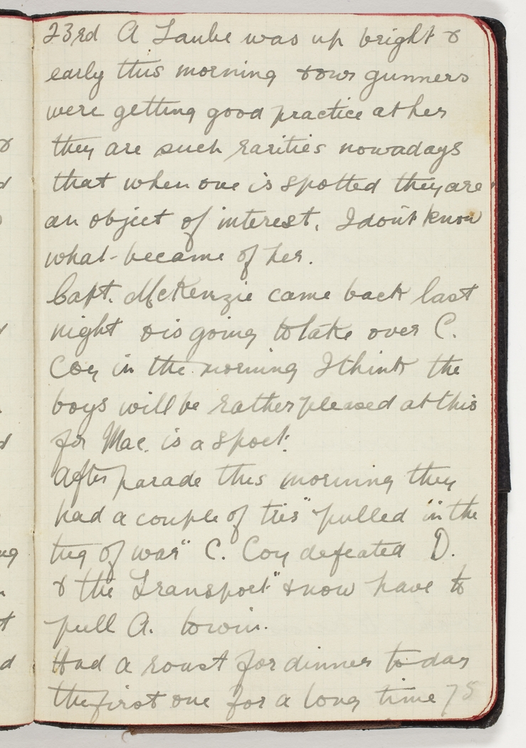 23rd. A Taube was up bright & early this morning & our gunners were getting good practice at her they are such rarities nowadays that when one is spotted they are an object of interest, I don't know what became of her.