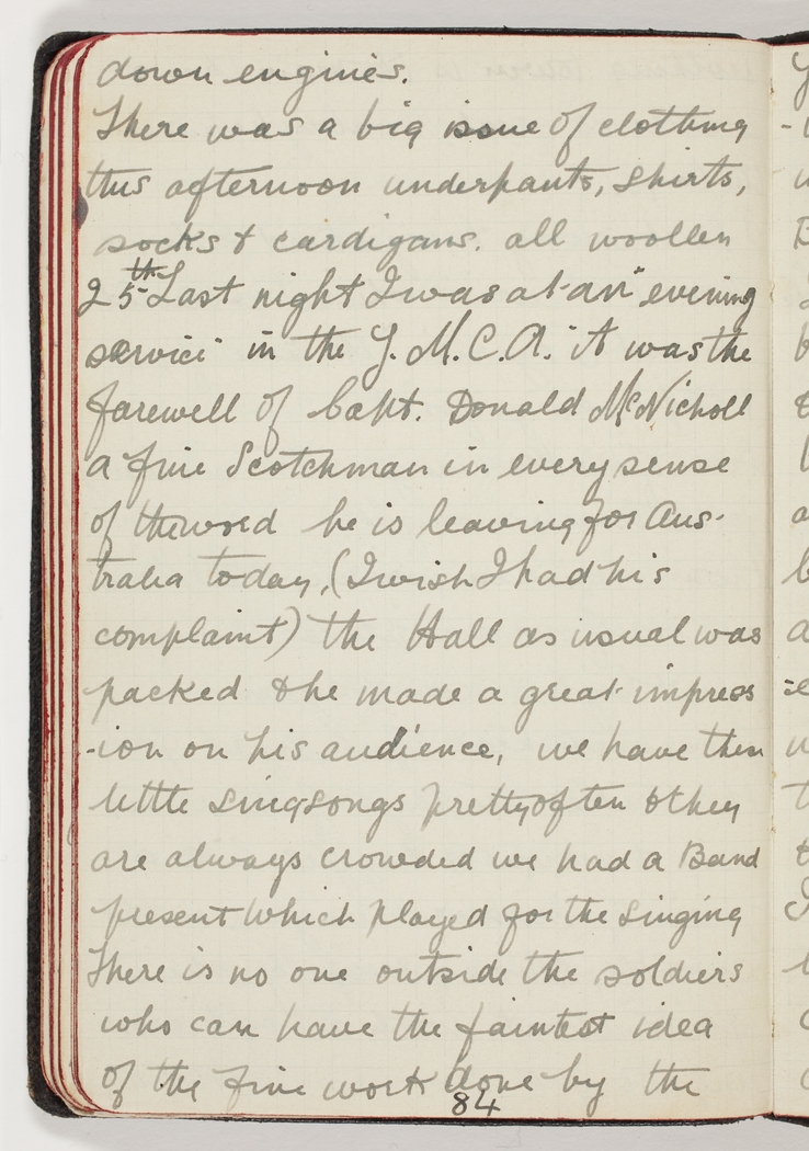 25th. Last night I was at an "evening service" in the Y.M.C.A. it was the farewell of Capt. Donald McNicholl a fine Scotchman in every sense of the word he is leaving for Australia today, (I wish I had his complaint) the Hall as usual was packed & he made a great impression on his audience, we have these little singsongs pretty often & they are always crowded we had a Band present which played for the singing