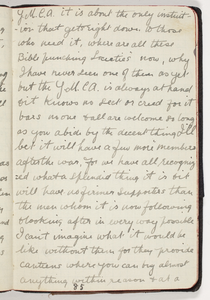 Y.M.C.A. it is about the only institution that gets right down to those who need it, where are all these Bible punching Societies now, why I have never seen one of them as yet but the Y.M.C.A. is always at hand & it knows no sect or creed for it bars no one & all are welcome so long as you abide by the decent thing I'll bet it will have a few more "members" after the war, for we have all recognized what a splendid thing it is & it will have no firmer supporters than the men whom it is now following & looking after in every way possible I can't imagine what it would be like without them for they provide canteens where you can buy almost anything within reason & at a