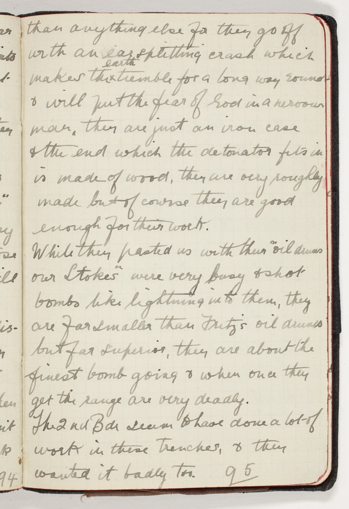 While they pasted us with their "oil drums our Stokes" were very busy & shot bombs like lightning into them, they are far smaller than Fritz's oil drums but far superior, they are about the finest bomb going & when once they get the range are very deadly.