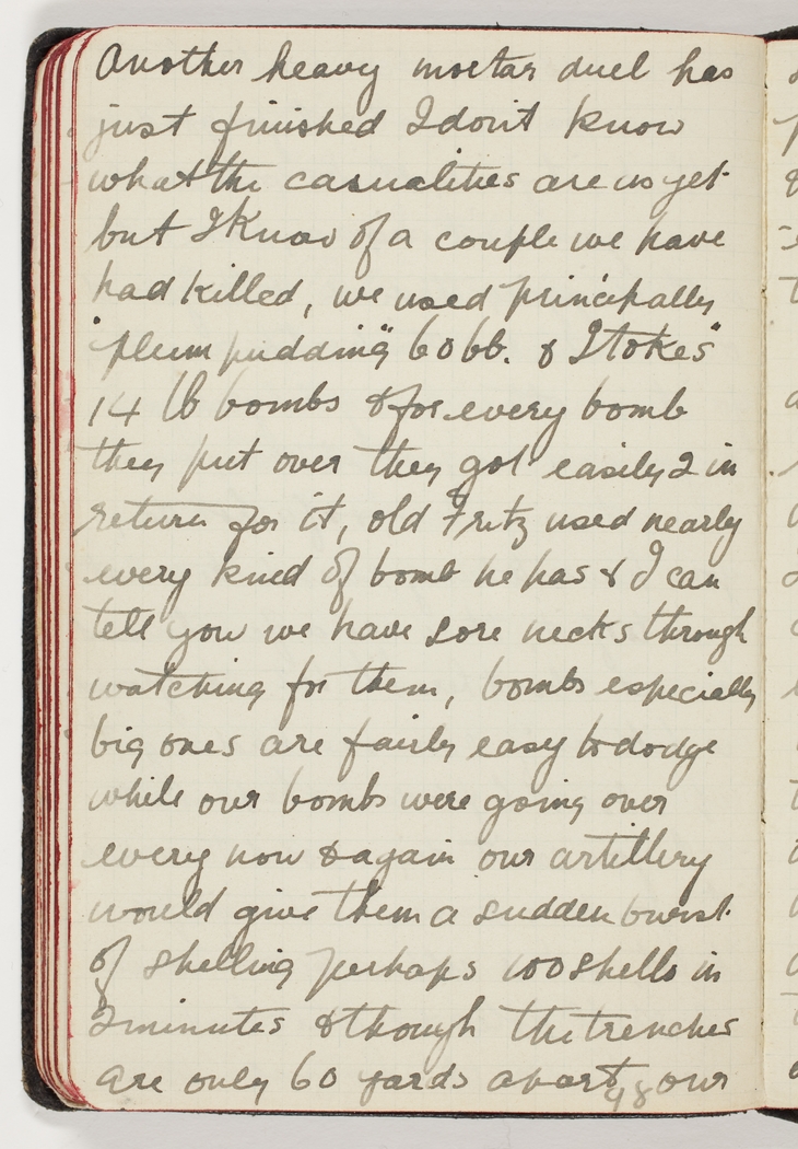 Another heavy mortar duel has just finished I don't know what the casualities are as yet but I know of a couple we have had killed, we used principally "plum pudding" 60 bb. & Stokes 14 lb bombs & for every bomb they put over they got easily 2 in return for it, old Fritz used nearly every kind of bomb he has & I can tell you we have sore necks through watching for them, bombs especially big ones are fairly easy to dodge while our bombs were going over every now & again our artillery would give them a sudden burst of shelling perhaps 100 shells in 2 minutes & though the trenches are only 60 yards apart our