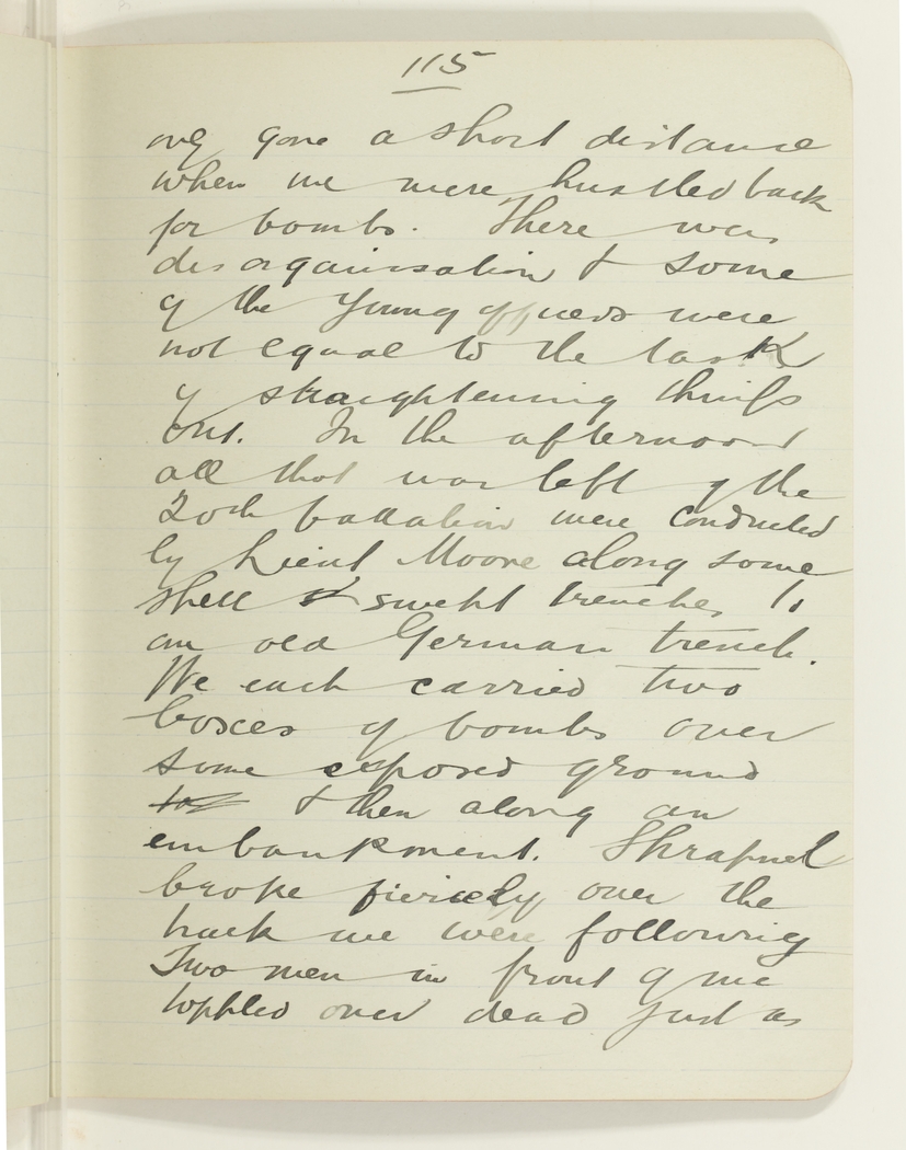 only gone a short distance when we were hustled back for bombs. There was disorganisation & some of the young officers were not equal to the task of straightening things out. In the afternoon all that was left of the 20th battalion were conducted by Lieut Moore along some shell swept trenches to an old German trench. We each carried two boxes of bombs over some exposed ground & then along an embankment. Shrapnel broke fiercely over the track we were following. Two men in front of me toppled over dead just as