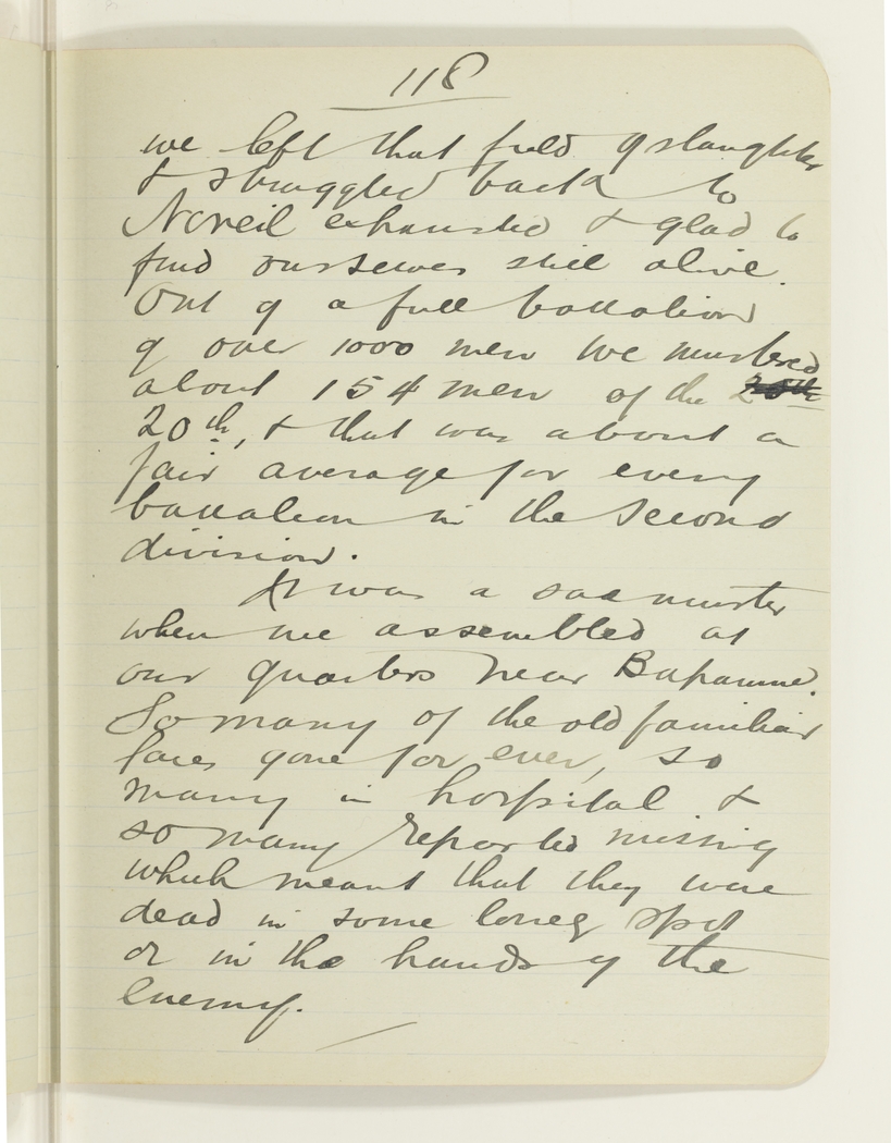 we left that field of slaughter & struggled back to Noreil [Noreuil] exhausted & glad to find ourselves still alive. Out of a full battalion of over 1000 men we numbered about 154 men of the 20th, & that was about a fair average for every battalion in the second division.