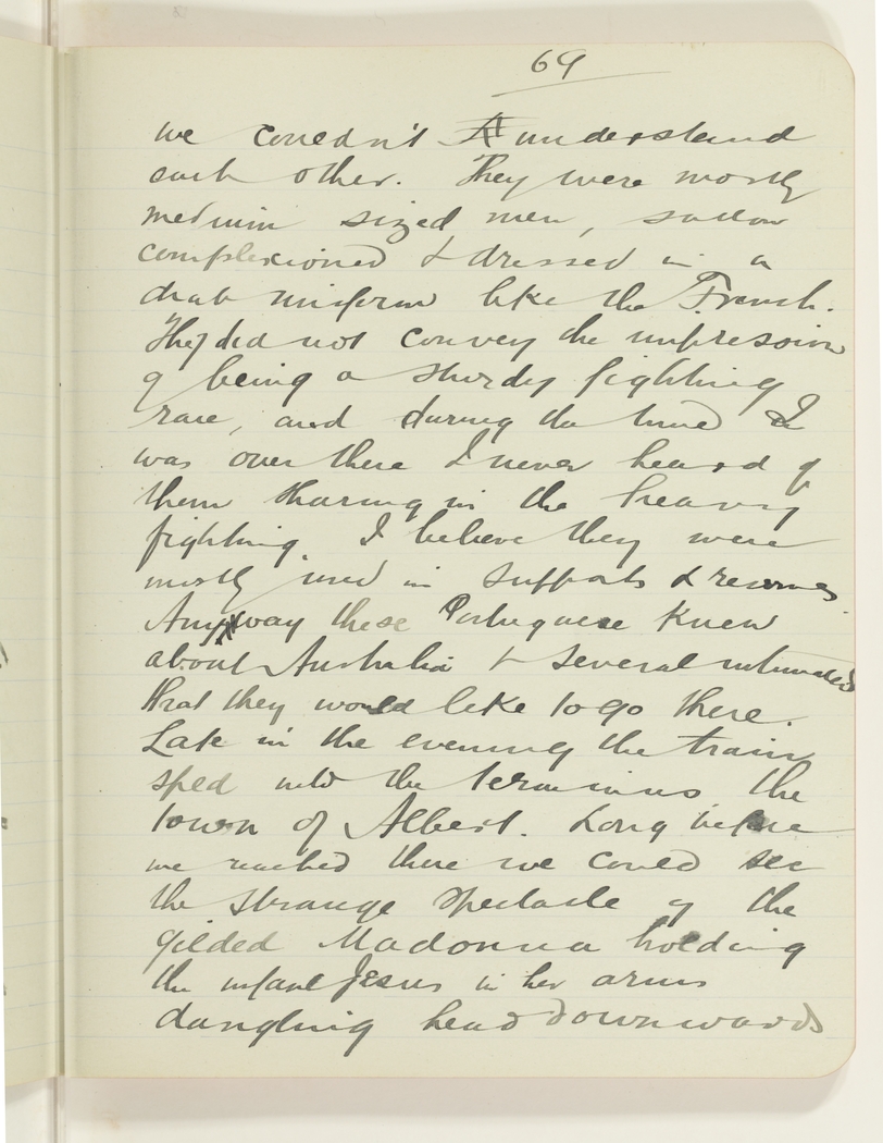 we couldn't understand each other. They were mostly medium sized men, sallow complexioned & dressed in a drab uniform like the French. They did not convey the impression of being a sturdy fighting race, and during the time I was over there I never heard of them sharing in the heavy fighting. I believe they were mostly used in supports & [indecipherable]. Anyway these Potuguese knew about Australia & several intimitated that they would like to go there. Late in the evening the train sped into the terminus, the town of Albert. Long before we reached there we could see the strange spectacle of the gilded Madonna holding the infant Jesus in her arms dangling head downwards