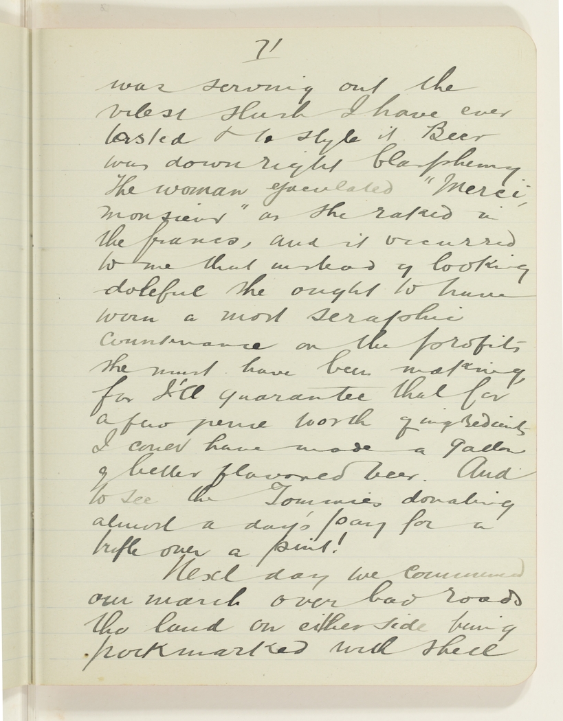 was serving out the vilest slush I have ever tasted & to style it Beer was downright blasphemy. The woman ejaculated "Merci Monsieur" as she raked in the francs, and it occurred to me that instead of looking doleful she ought to have worn a most serafobic countenance on the profits she must have been making for I'll guarantee that for a few pence worth of ingredients I could have made a gallon of better flavoured beer. And to see the Tommies donating almost a day's pay for a trifle over a pint!