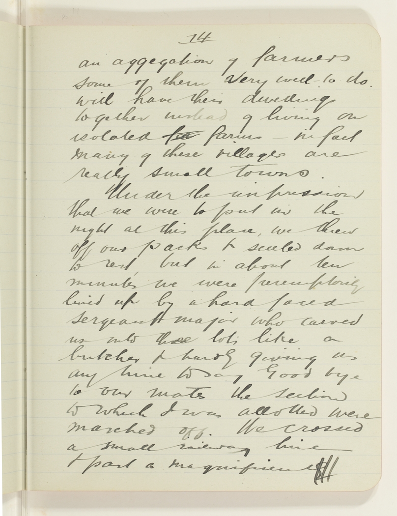 Under the impression that we were to put in the night at this place, we threw off our packs & settled down to rest, but in about ten minutes we were peremptorily lined up by a hard faced sergeant major who carved us into three lots like a butcher & hardly giving us any time to say Good bye to our mates, the section to which I was allotted were marched off. We crossed a small railway line & past a magnificent