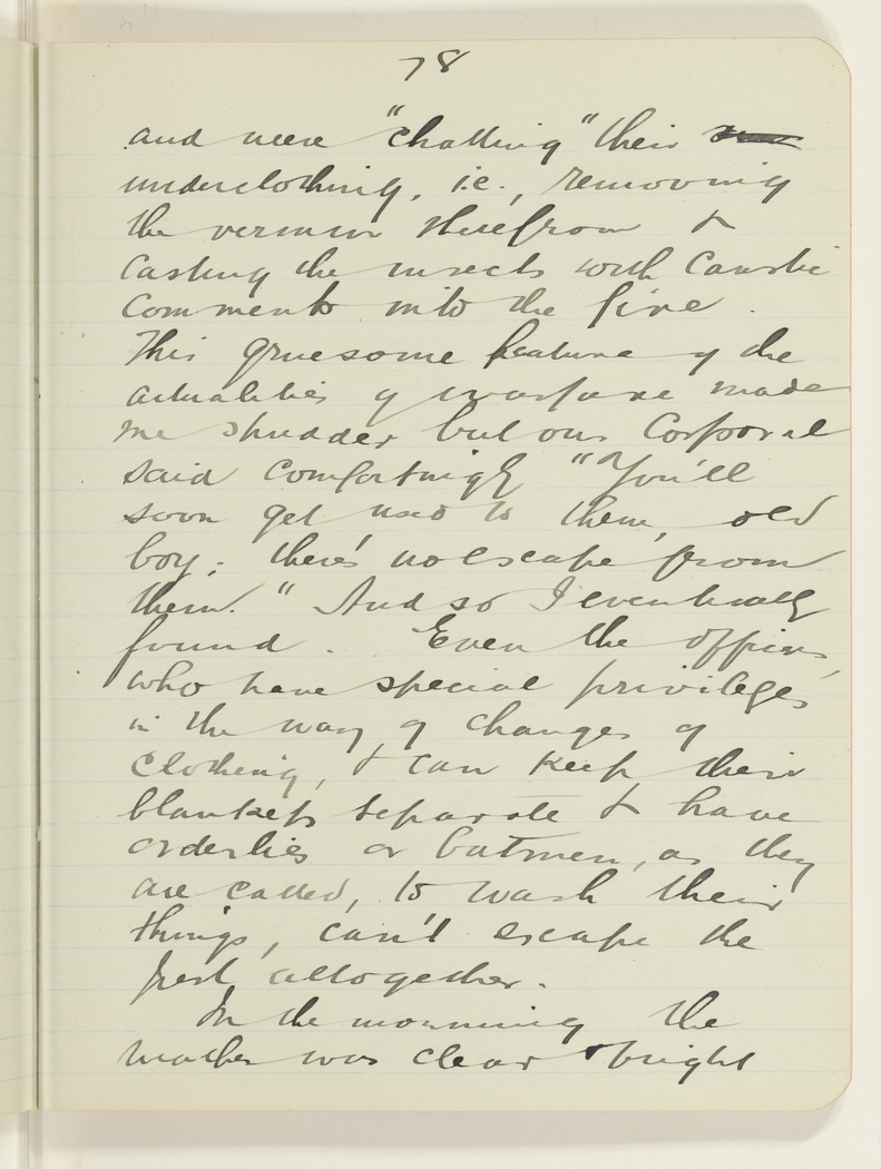 and were "chatting" their underclothing, i.e., removing the vermin therefrom & casting the insects with caustic comments into the fire. This gruesome feature of the actualities of warfare made me shudder but our Corporal said comfortingly, "You'll soon get used to them, old boy; there's no escape from them". And so I eventually found. Even the officers, who have special privileges in the way of changes of clothing, & can keep their blankets separate & have orderlies or batmen, as they are called, to wash their things, can't escape the pest altogether.