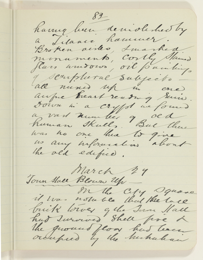 having been demolished by a Titanic hammer. Broken aisles, smashed monuments, costly stained glass windows, oil paintings of scriptural subjects - all mixed up in one awful heart rendering ruin. Down in a crypt we found a vast number of old human skulls. But there was no one there to give us any information about the old edifice.