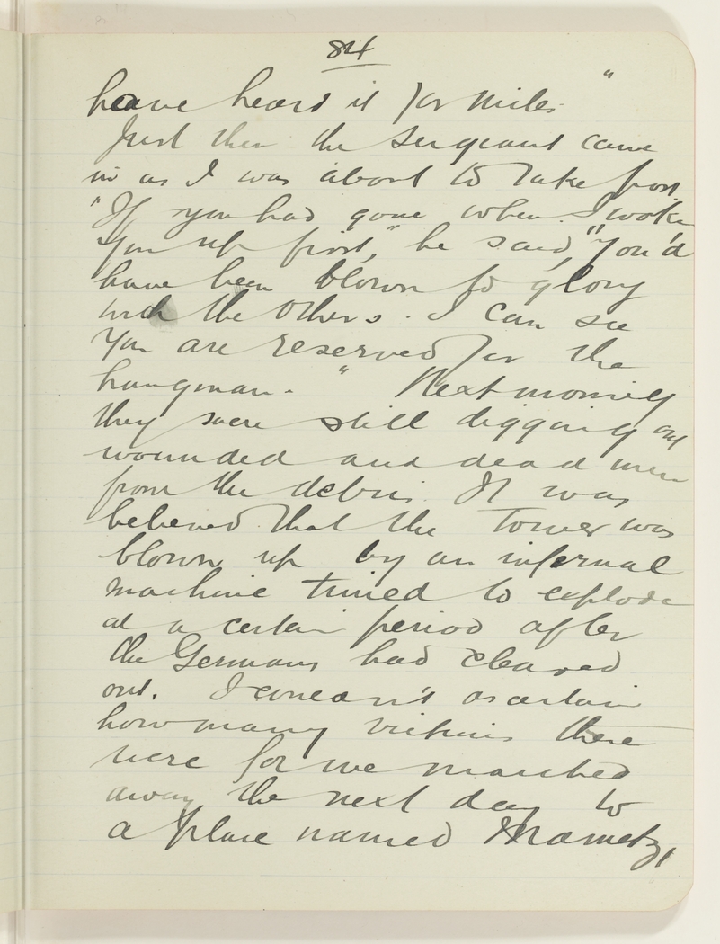 Just then the Sergeant came in as I was about to take post, 'If you had gone when I woke you up first", he said "you'd have been blown to glory with the others. I can see you are reserved for the hangman." Next morning they were still digging any wounded and dead men from the debris. It was believed that the tower was blown up by an infernal machine timed to explode at a certain period after the Germans had cleared out. I couldn't ascertain how many victims there were for we marched away the next day to a place named Mametz,