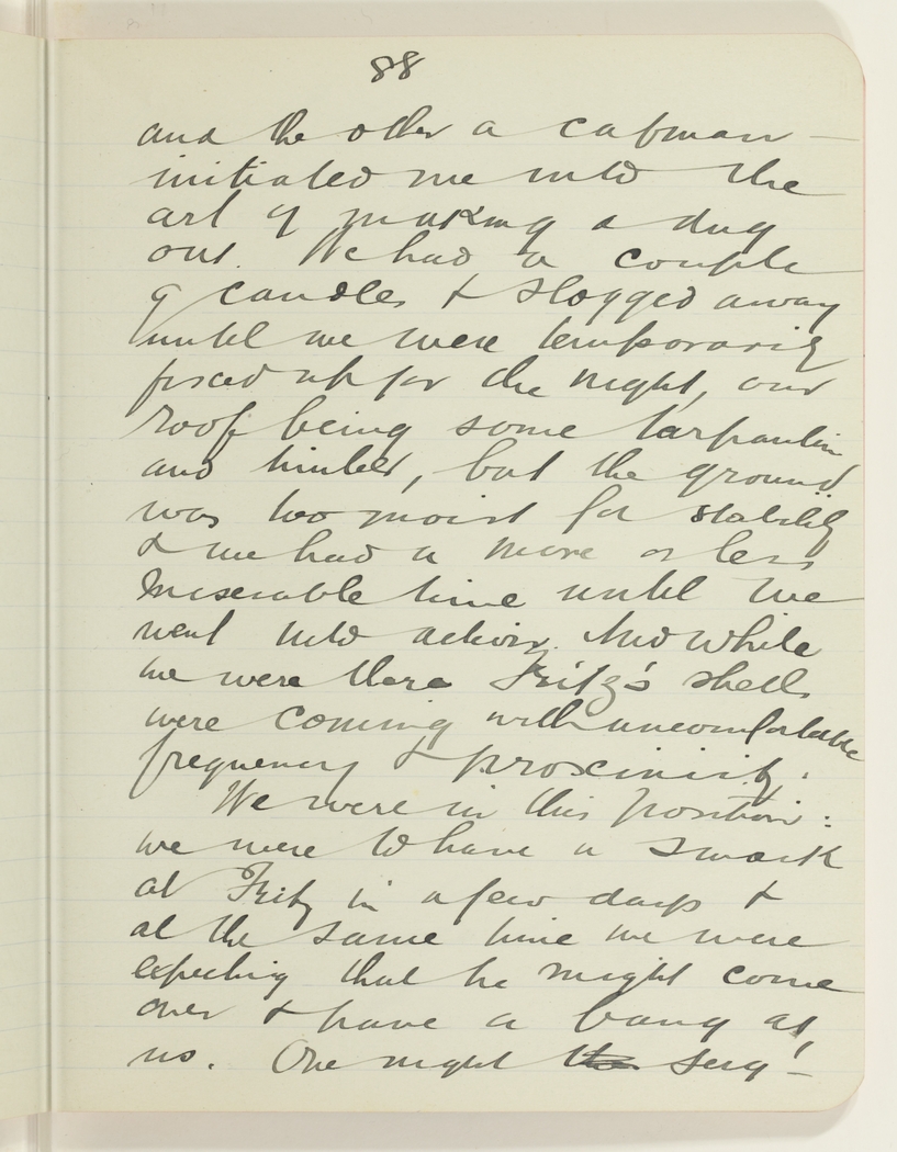 and the other a cabman - initiated me into the art of making a dug out. We had a couple of candles & slogged away until we were temporarily fixed up for the night, our roof being some tarpaulins and timber, but the ground was too moist for stability & we had a more or less miserable time until we went into action. Now while we were there Fritz's shells were coming with uncomfortable frequency & proximity.