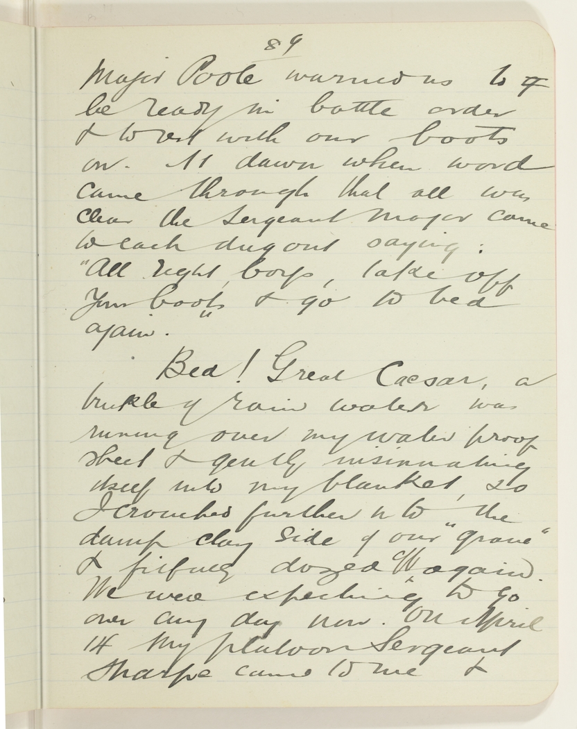 Bed! Great Caesar, a trickle of rain water was running over my water proof sheet & gently insinuating itself into my blanket, so I crouched further into the damp clay side of our "grave" & fitfully dozed off again. We were expecting to go over any day now. On April 14 my platoon Sergeant Sharpe came to me &