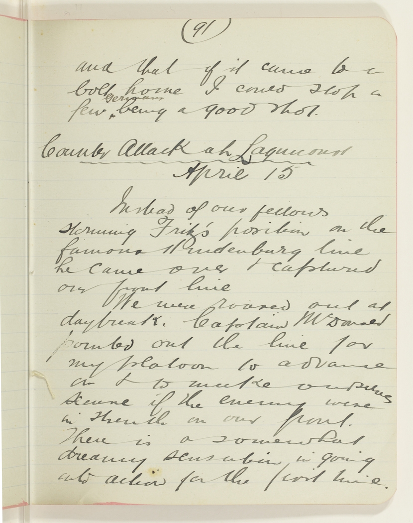 We were roared out at daybreak. Captain McDonald pointed out the line for my platoon to advance on & to make ourselves secure if the enemy were in strenth [strength] on our front. There is a somewhat dreamy sensation in going into action for the first time.