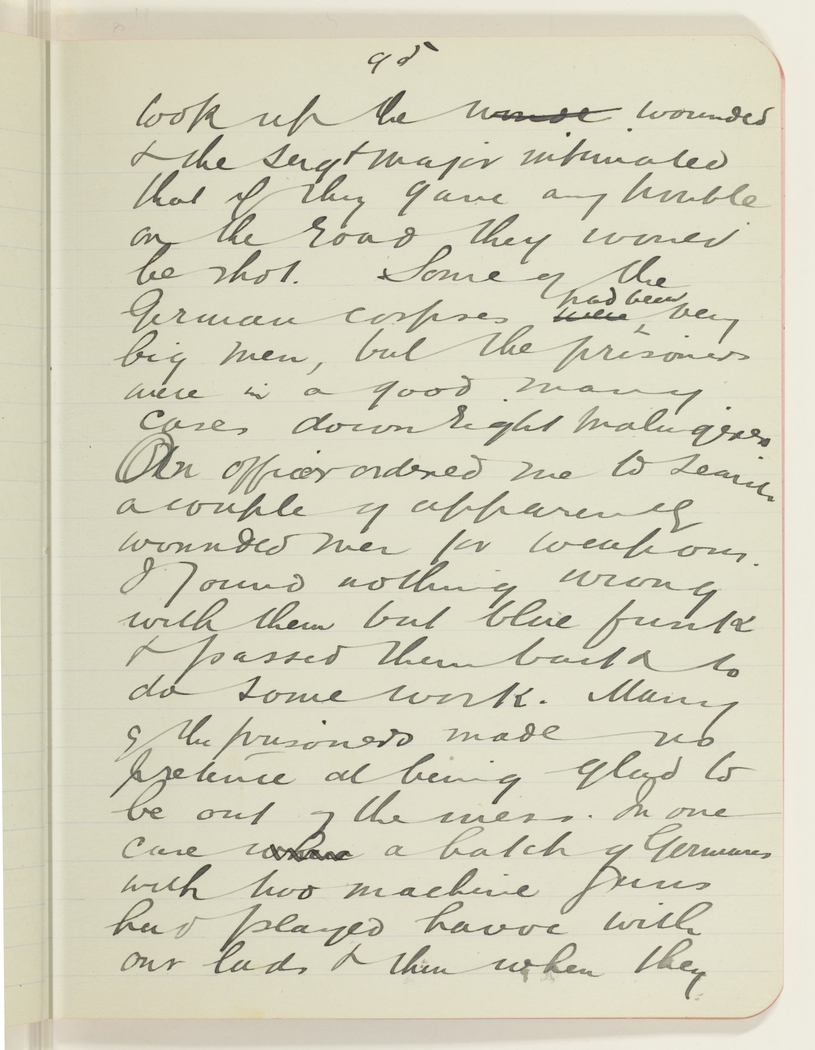 took up the wounded & the Sergt Major intimated that if they gave any trouble on the road they would be shot.   Some of the German corpses had been very big men, but the prisoners were in a good many cases down right malingerers.   An officer ordered me to search a couple of apparently wounded men for weapons.   I found nothing wrong with them but blue funk & passed them back to do some work.   Many of the prisoners made no pretense at being glad to be out of the mess.   In one case a batch of Germans with two machine guns had played havoc with our lads & then when they