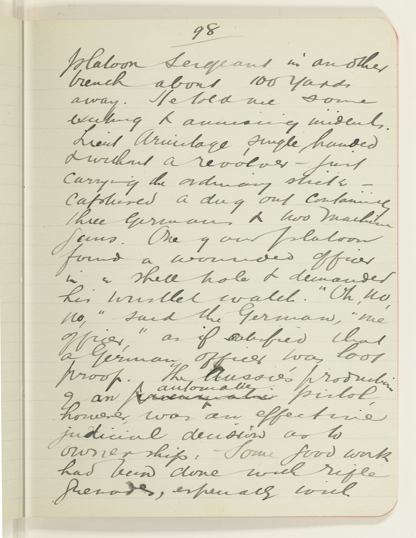 platoon Sergeant in another trench about 100 yards away. He told me some exciting & amusing incidents. Lieut Armitage single handed & without a revolver - just carrying the ordinary stick - captured a dug out containing three Germans & two machine guns. One of our platoon found a wounded officer in a shell hole & demanded his wristlet watch. "Oh, no, no" said the German, "me officer", as if satisfied that a German officer was loot proof. The Aussie's production of an automatic pistol, however, was an effective judicial decision as to ownership. Some good work had been done with rifle grenades, especially with