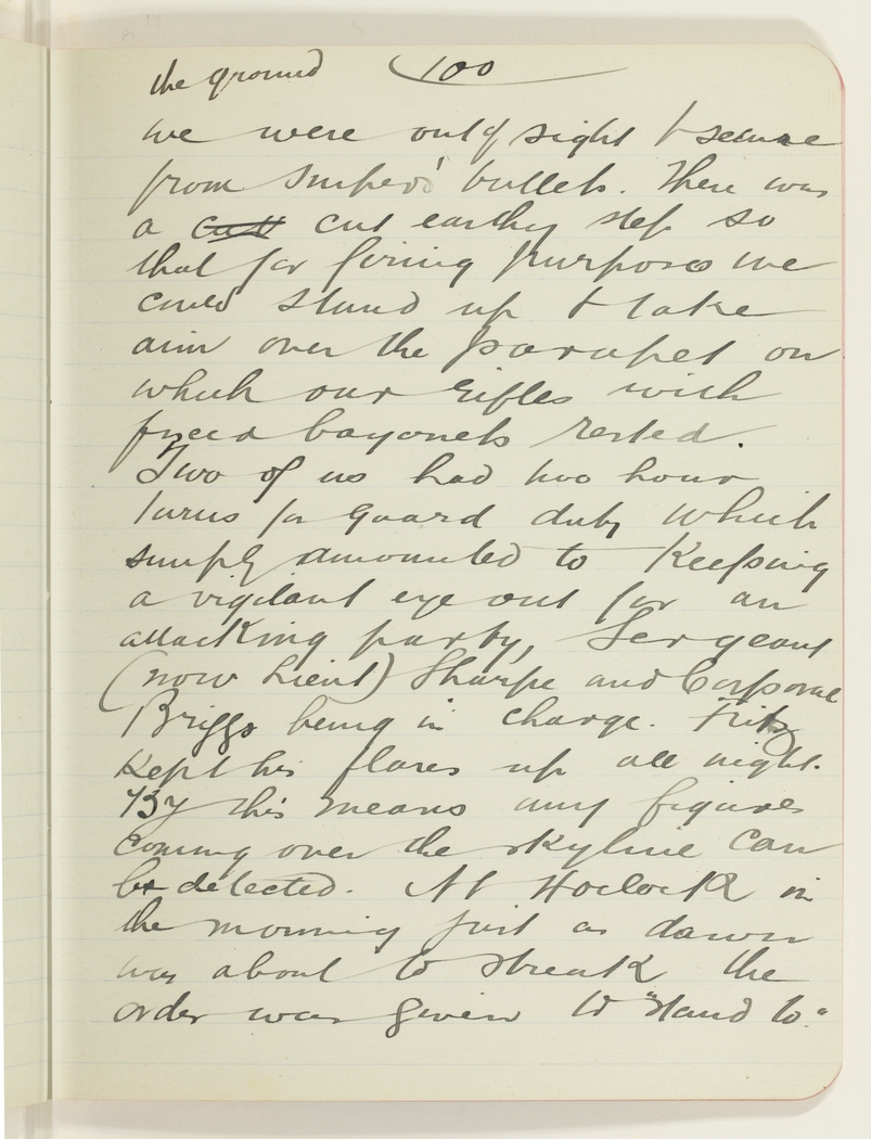 the ground. We were out of sight & secure from snipers' bullets. There was a cut earthy step so that for firing purposes we could stand up & take aim over the parapet on which our rifles with fixed bayonets rested. Two of us had two hour turns for guard duty which simply amounted to keeping a vigilant eye out for an attacking party, Sergeant (now Lieut) Sharpe and Corporal Briggs being in charge. Fritz kept his flares up all night. By this means any figures coming over the skyline can be detected. At 4 o'clock in the morning just as dawn was about to break the order was given to "stand to".