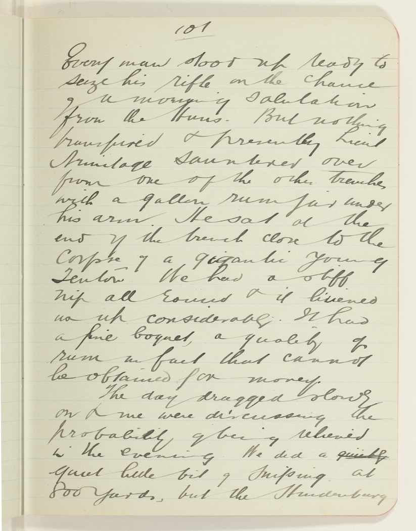 Every man stood up ready to seize his rifle on the chance of a morning salutation from the Huns.   But nothing transpired & presently Lieut Armitage sauntered over from one of the other trenches with a gallon rum far under his arm.   He sat at the end of the bench close to the corpse of a gigantic young Teuton.   We had a stiff nip all round & it livened us up considerably.   It had a fine bouquet, a quality of rum in fact that cannot be obtained for money.