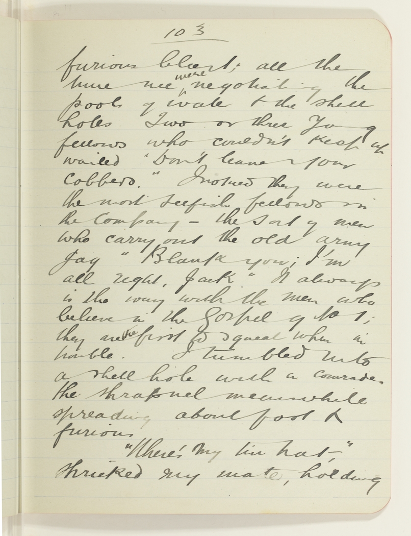 furious blast; all the time we were negotiating the pools of water & the shell holes. Two or three young fellows who couldn't keep up wailed "Don't leave your cobbers". I noticed they were the most selfish fellows in the company - the sort of men who carry out the old army gag "Blank you; I'm all right, Jack". It always is the way with the men who believe in the Gospel 9 to 1; they are the first to squeal when in trouble. I tumbled into a shell hole with a comrade, the shrapnel meanwhile spreading about fast & furious.