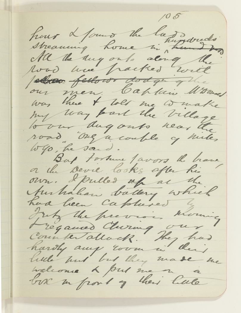 But fortune favors the brave, or the devil looks after his own. I pulled up at the Australian battery which had been captured by Fritz the previous morning & regained during our counter attack. They had hardly any room in their little hut but they made me welcome & put me on a box in front of their little