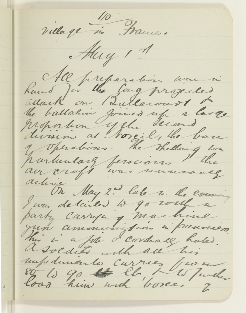 On May 2nd late in the evening I was detailed to go with a party carrying machine gun ammunition in panniers. This is a job I cordially hated. A soldier with all his impediments carries from 80 to 90 lb, & to further load him with boxes of