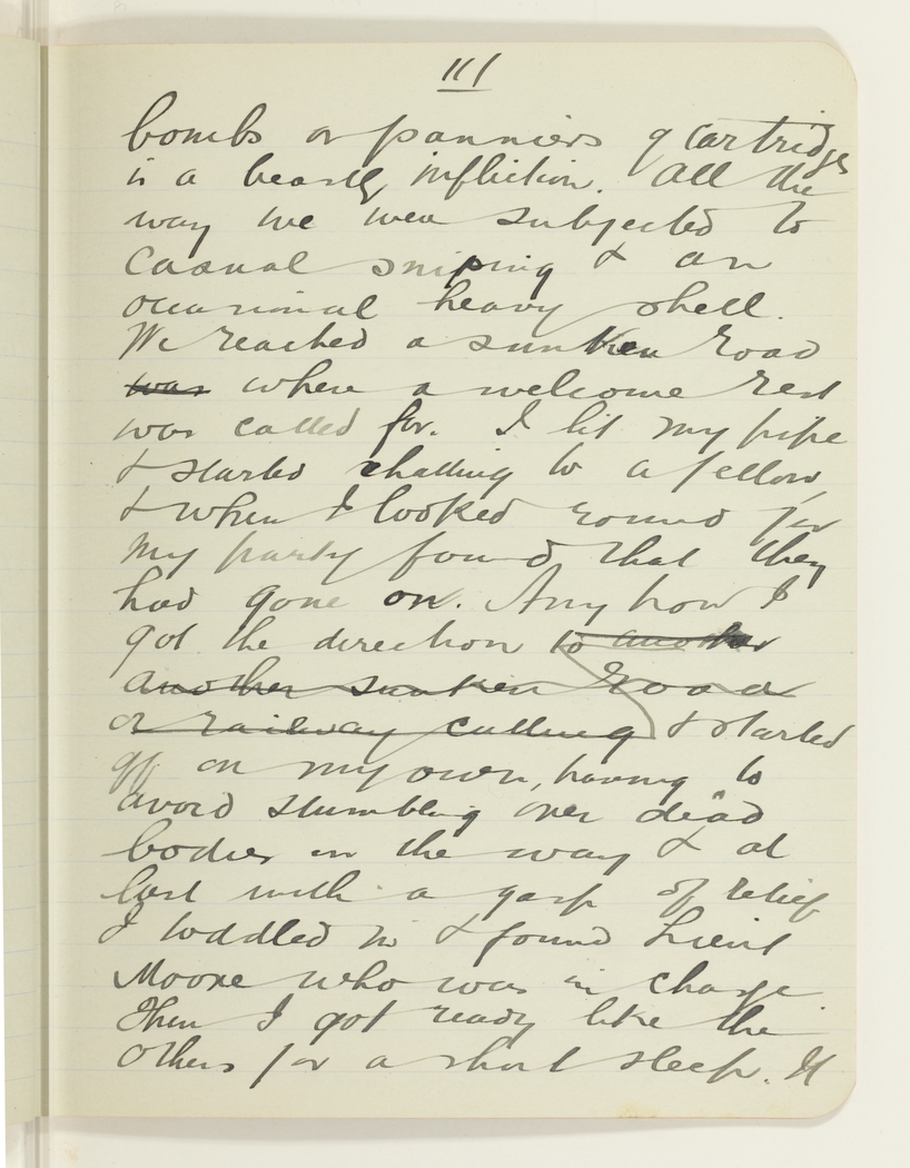 bombs or panniers of cartridges is a beastly infliction.  All the way we were subjected to casual sniping & an occasional heavy shell.   We reached a sunken road was where a welcome rest was called for.   I lit my pipe & started chatting to a fellow, & when I looked round for my party found that they had gone on.   Anyhow I got the direction to another another sunken road or railway cutting and started off on my own, having to avoid stumbling over dead bodies on the way & at last with a gasp of relief I toddled in & found Lieut Moore who was in charge.   Then I got ready like the others for a short sleep.   It