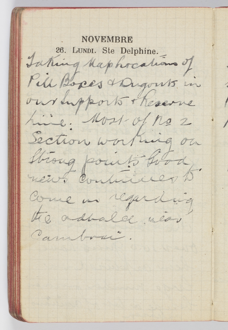 Taking map locations of Pill Boxes & Dugouts in our Supports & Reserve line. Most of No. 2 Section working on strong points. Good news continues to come in regarding the advance near Cambrai.