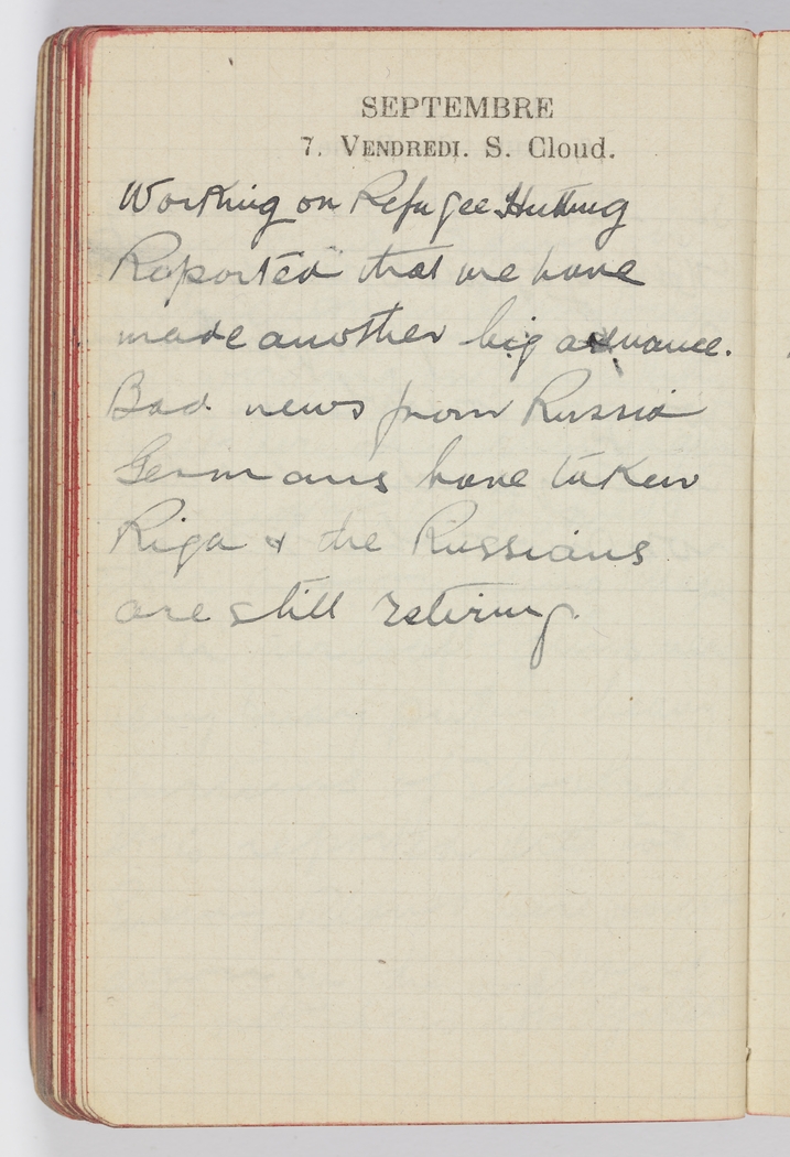 Working on Refugee Hutting. Reported that we have made another big advance. Bad news from Russia. Germans have taken Riga & the Russians are still retiring.