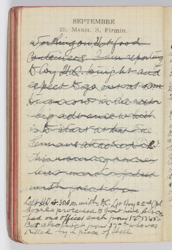Very heavy shelling on all our positions all day & we have had heavy casualties. Back at H.Q. 3 p.m.