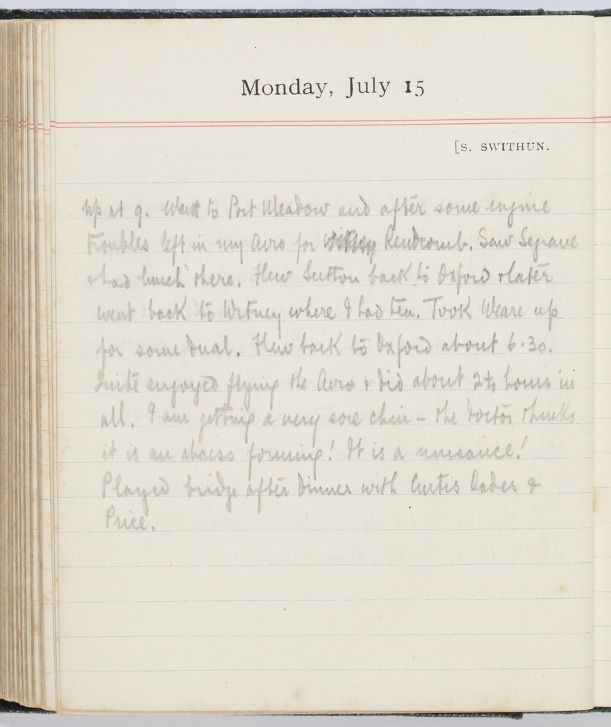 Up at 9. Went to Port Meadow and after some engine troubles left in my Avro for Witney Rendcomb. Saw Segrave & had lunch there. Flew Sutton back to Oxford & later went back to Witney where I had tea. Took Weare up for some dual. Flew back to Oxford about 6.30. Quite enjoyed flying the Avro & did about 2¼ hours in all. I am getting a very sore chin – the Doctor thinks it is an abcess forming! It is a nuisance! Played bridge after dinner with Curtis, Oades & Price.