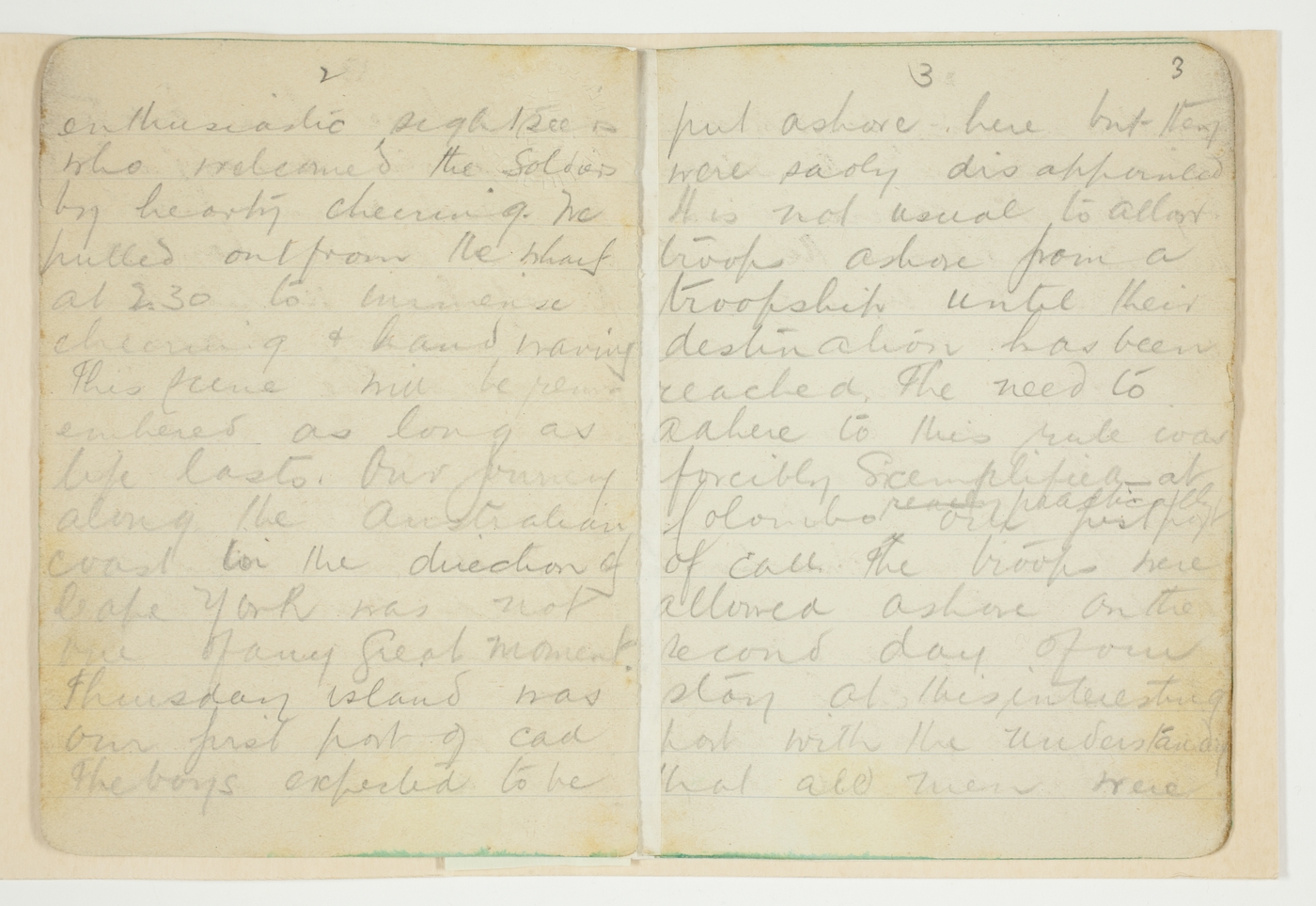 enthusiastic sightseers who welcomed the Soldiers by hearty cheering. We pulled out from the wharf at 2.30 to immense cheering & hand waving. This scene will be remembered as long as life lasts. Our journey along the Australian coast in the direction of Cape York was not one of any great moment. Thursday Island was our first port of call. The boys expected to be put ashore here but they were sadly disappointed. It is not usual to allow troops ashore from a troopship until their destination has been reached. The need to adhere to this rule was forcibly exemplified practically at Colombo our first port of call. The troops were allowed ashore on the second day of our stay at this interesting port with the understanding that all men were