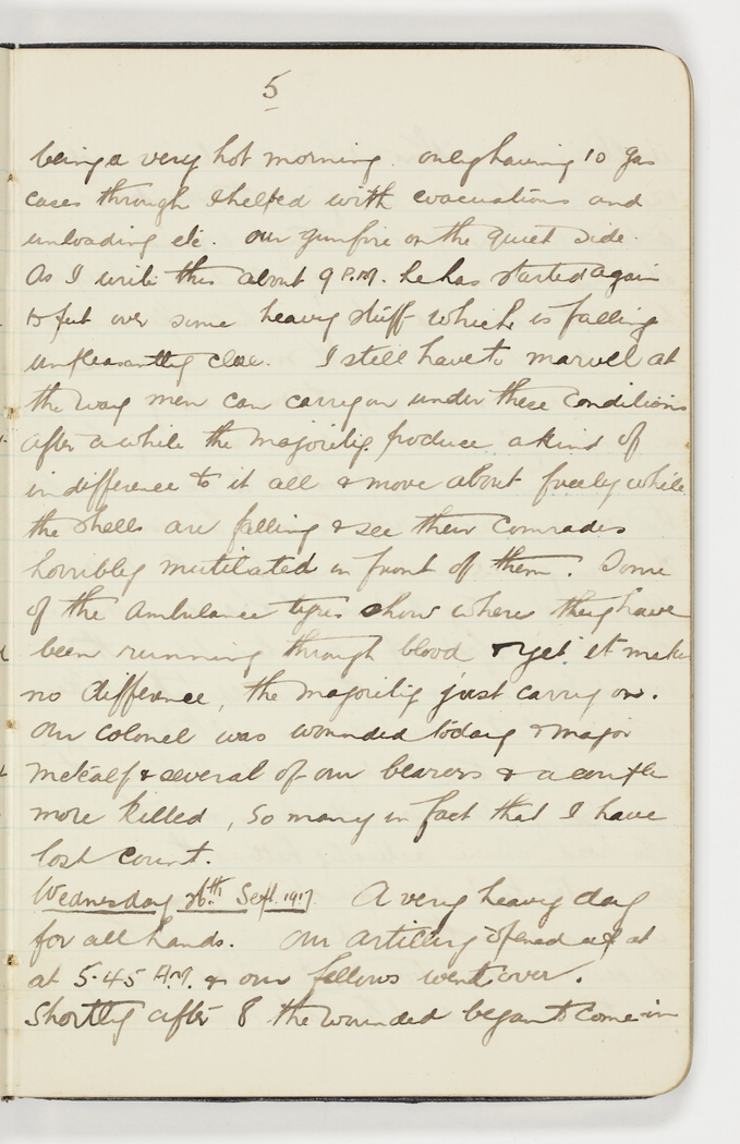 Wednesday 26th Sept. 1917 A very heavy day for all hands. Our artillery opened up at 5.45 A.M. & our fellows went over. Shortly after 8 the wounded began to come in